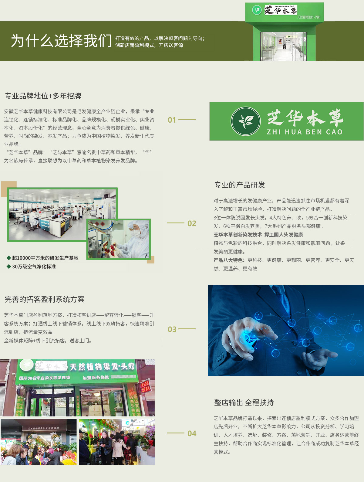 品牌介紹 安徽芝華本草健康科技有限公司是毛發健康全產業鏈企業,秉承“專業連鎖化、連鎖標準化、標準品牌化、品牌規模化、規模實業化、實業資本化、資本股份化”的經營理念,全心全意為消費者提供綠色、健康、營養、時尚的染發、養發產品;力爭成為中國植物染發、養發新生代專業品牌。 “芝華本草”品牌:“芝與本草”意喻名貴中草藥和草本精華,“華”為名族與傳承,直接聯想為以中草藥和草本植物染發養發品牌。 經營理念 精...